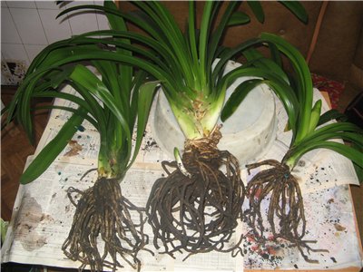 Раз в два года растение просит пересадки, напоминая о себе вылезающими на поверхность земли толстыми белыми корнями (этот момент очень хорошо заметен). Из специальной цветоводческой литературы я узнала, что корни кливии не любят, когда их тревожат. И когда они начинают вылезать на поверхность, нужно аккуратно вынуть растение из горшка и пересадить его в большую емкость. Некоторое время я так и делала, пока емкость, по моему мнению, не достигла предельно допустимой нормы, то есть стала неприлично большой, а корням и этого было мало. Тогда я рискнула - и обломала при пересадке часть особенно отросших в длину корней и, поменяв землю, посадила цветок в тот же горшок. Кливия никак не отреагировала на этот акт вандализма с моей стороны.