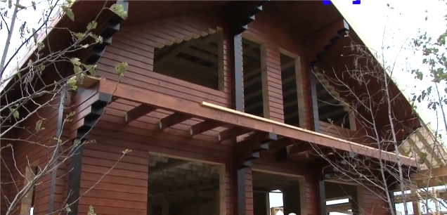 Не лучше повел себя лак и на южной стороне дома. На нем отчетливо видны серые пятна и с них уже полностью сошло защитное лакокрасочное покрытие. Кстати, здесь дом был покрыт качественным лаком в два слоя. Ультрафиолетовые лучи "выжгли" довольно значительную часть лакокрасочного покрытия.