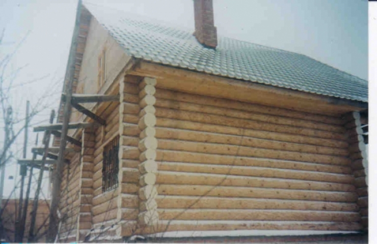Дом построили за один сезон. Сруб сложили из бруса (20x20 см), стены снаружи и внутри отделали светлой вагонкой. Крутую двускатную крышу покрыли красным шифером.