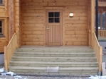 Опорой для ступеней служит кладка в два кирпича на отдельном фундаменте (на песчаной почве перекосов обычно не бывает). Причем использован тот же силикатный кирпич, которым отделан дом. Площадка крыльца (150x100 см) - с двумя противостоящими маршами, ориентированными вдоль дома (угловой тип крыльца). От стены до края лестницы - 110 см. Высота ступеней - 15 см, ширина - 30 см при угле наклона лестницы около 45°. Шпунтованные доски на площадке и ступенях толщиной около 40 мм. Крыльцо хозяева покрасили половой масляной краской теплого шоколадного цвета.