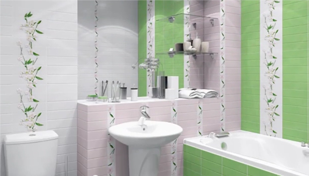 В санузле ряд целых плиток должен начинаться от уровня ванны. Если хотите украсить ванную фартуком или бордюрной плиткой, учтите, что облицовка хорошо смотрится, когда бордюр проходит над умывальником, а над уровнем ванны поднят не менее, чем на 2/3 плитки.