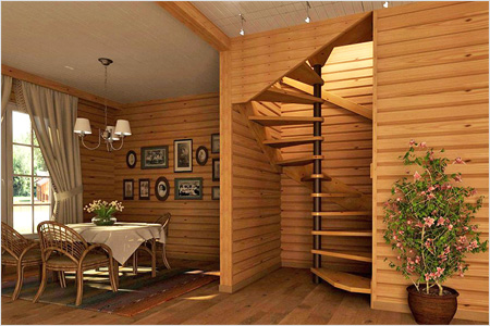 Когда сложили печь, возникли вопросы: где расположить лестницу в мансарду? Какую конструкцию предпочесть? Снова взялись за альбомы и проекты. Остановились на деревянной винтовой лестнице, а разместили ее перед печью, напротив входа. Выбор продиктован недостатком места. Винтовая лестница более сложна в изготовлении, чем обычная, зато ее конструкция эстетичнее. Более того, расположение лестницы оказалось максимально удачным, так как находится она сразу при входе в дом с веранды, и чтобы попасть в мансарду, не надо проходить через гостиную или кухню. Для окраски использовали Pinotex "калужница", затем покрыли стойким к истиранию нитроцеллюлозным лаком, и золотисто-янтарная лестница великолепно вписалась в интерьер кухни.