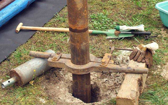 Как устроена нижняя труба с фильтром? На конце ее навернута муфта с зубьями (шлямбур), которая при вращении забирает грунт внутрь. А из труб он выбирается с помощью желонки. Выше шлямбура в трубе в шахматном порядке насверлены 10-миллиметровые отверстия.