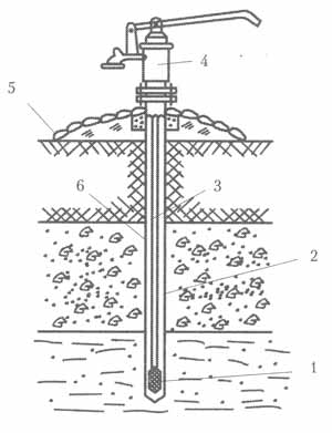 Колодец-скважина (см. рис.): 1 — фильтр; 2 — водоприемная часть скважины; 3 — водоподъемная труба; 4 — ручной насос; 5 — отмостка; 6 — скважина.