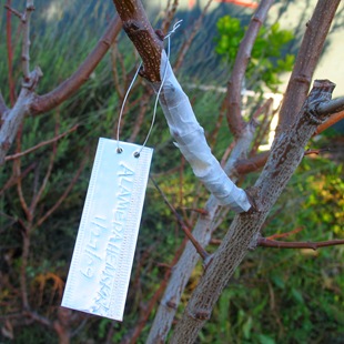 Для этого лучше всего подходит жесткая алюминиевая фольга. Но сгодится и от тюбика из-под зубной пасты. Из одного получается 4-6 бирок. Название культуры делаем, выдавливая обычной шариковой ручкой, подложив, например, общую тетрадь. Крепим бирки медной проволокой. Благодаря такому «занудству», нам удается помнить названия и сорта всех высаженных культур.