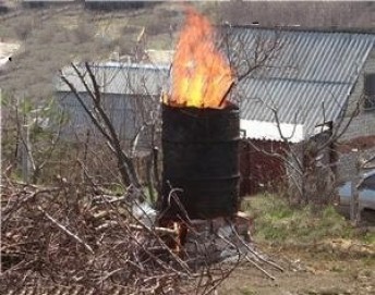 Первую печь я сделал так: пробил в днище и по бокам старой железной бочки несколько десятков отверстий и установил бочку на три кирпича, чтобы снизу поступал необходимый для горения воздух. Сначала поджигал заложенные внутрь сухие древесные отходы. Дожидался, когда они начинали интенсивно гореть, и закладывал подвяленную ботву вперемешку с ветками. Сначала печка горела хорошо, но постепенно огонь ослабевал. Приходилось постоянно ворошить отходы, иначе отверстия в дне бочки забивала зола, а боковые перекрывались еще несгоревшим мусором.