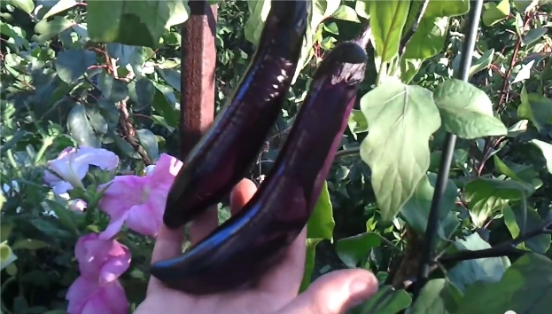 Есть у меня интересные баклажаны и с синими плодами: Шалун, похожий на Санчо Панса, но с "ядрами" весом до 1600 г, и Бард высотой до 2 м, на этом "дереве" вырастают крупные, килограммовые плоды. Баклажаны плохо восстанавливают корневую систему. Поэтому, хотя есть рекомендации пикировать сеянцы, я сею семена сразу в торфяные горшочки. На постоянное место высаживаю растения в возрасте 70-75 дней. Это лучшее время для пересадки. Особых отличий в агротехнике баклажанов нетрадиционной окраски нет. Учитываю, что это растения влажных субтропиков. Они любят хороший полив и завязывают плоды при коротком дне: у нас - в мае и в конце лета. Но если их притенять в июне-июле, когда стоит жара под 30°, то урожай поспевает и раньше. Хотя плоды получаются мельче.