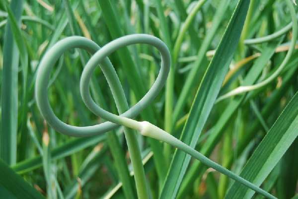 В прошлом сезоне нас удивила грядка с чесноком. Цветочные стрелки у чеснока были змеевидно искривленные и короткие (не более 20 см). Причем они будто пробивались через листья.