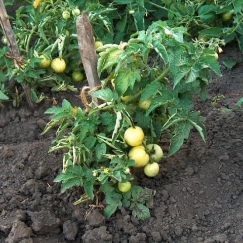 Растения формирую в два стебля. Своевременно убираю все пасынки, не даю им перерастать. Делаю это непременно в первой половине дня, чтобы к вечеру ранки подсохли. Для профилактики болезней опрыскиваю посадку медьсодержащими препаратами: первый раз - через 3 недели после высадки, второй - спустя еще две недели. В июне томаты дважды подкармливаю настоем коровяка и суперфосфата (1 ст. ложка на 10 л), в который добавляю зольную вытяжку (1 л на ведро настоя). После внесения удобрений поливаю растения теплой водой. Когда влага впитается, мульчирую грядку торфом или соломистым перегноем слоем 5 см.