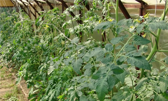 В этом году нашему семейному хозяйству исполнилось пятнадцать лет. Теплицу со временем расширили, добавили еще один отсек. Сейчас она занимает 400 кв.м (длина 40 м, ширина 10 м, высота 2,5 м). Внутри отапливаемой теплицы три отделения: два под томатами, одно под огурцами. По периметру отсеков и через каждые 1,2 м между грядами проложили бетонные дорожки. На грядке томаты высаживаем в два рядка, расстояние между растениями в ряду 30-40 см. При такой схеме посадки и растениям комфортно, и ухаживать за ними легко.