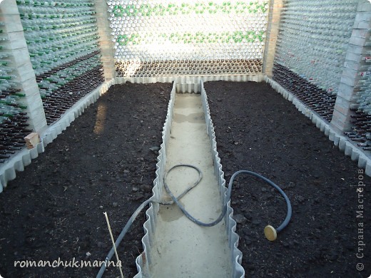 Фундамент для парника мы сделали монолитный, из бетона, который приготовили, смешав цемент М-400, песок, гравий и воду в соотношении 1:4:3,8:0,8. Через трое суток сняли опалубку. Западную сторону (длиной 7,75 м) разделили на пять равных отрезков, возвели из кирпича соответственно шесть (равной высоты) опорных столбов высотой 2 м, выложили стенку из пустых и без пробок бутылок горлышком внутрь. Северную сторону (5 м) разбили условно на три части и сложили два столба так, чтобы угол наклона крыши составлял 20-25°. Восточную и северную стороны полностью застеклили с помощью деревянных оконных рам, закрепленных на деревянных стойках. По южной стороне установили два кирпичных столбика для двери. Стены в оставшихся помещениях до высоты 6 м выложили из бутылок, затем сделали деревянный каркас и закрепили остекленные рамы. Готовя раствор для кладки бутылок, воды взяли меньше, чтобы раствор напоминал по вязкости густую сметану. От следов раствора, пока цемент не засох, бутылки протирали мягкой тканью. А если бутылки все же пачкались, отмывали их с помощью грубой ткани.