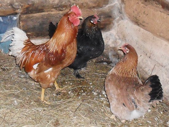 За капризными "средиземноморцами" в теплые сараи пошли австролорпы и вельзумеры, у которых гребни и сережки также не малы. Более холодостойких юрловских, русских хохлатых и московских белых пришлось перевести в теплые помещения пораньше - цыплята были позднего вывода и на улице могли заболеть.