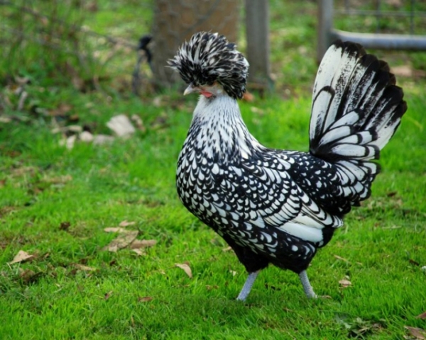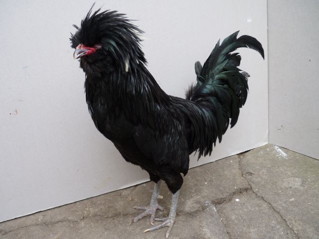 Курица. Более компактная, чем петух, с более низкой посадкой, корпус расположен более горизонтально. Хохол большой, близок к шарообразной форме, но не свисает и не мешает птице смотреть. Хорошо выражены борода и баки. Оперение плотно прилегает.