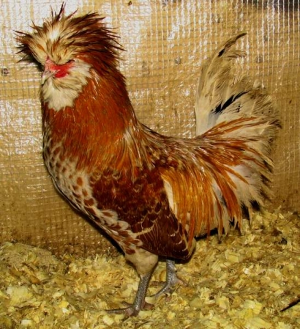 Петух. Голова среднего размера, высокая, с выростом на черепе. Клюв мощный, изогнутый, с приподнятыми ноздрями, серо-голубого цвета. Гребень отсутствует. Маленькое мясистое возвышение на месте гребня не считается таковым. Глаза коричневые (если в описании расцветки не указан иной цвет). Лицо красное, в основном закрыто перьями. Ушные мочки маленькие, полностью закрыты бородой и баками. Сережки отсутствуют или едва обозначены. Хохол полный, округлой формы. Внутренние и передние перья образуют основу хохла, наружные боковые и задние обрамляют хохол и ниспадают, не мешая птице видеть.