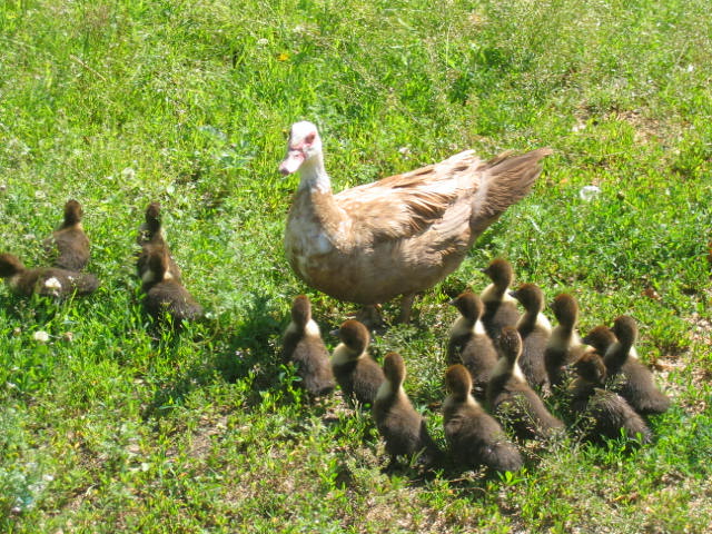 В результате первые утята появились в тот год только в начале августа, но что это были за утята! К началу октября многие из них уже весили 4,5-5 кг! Был у этого альянса и другой плюс: мускусные утки оказались гораздо более внимательными мамашами и насиживали все яйца без разбору, так что у меня к осени по двору бегало много гибридных утят. Видимо, дело было не в селезнях, а в самих утках.