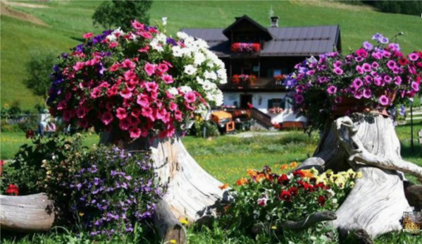 Войдя в калитку, вы опять окажетесь в окружении цветов. С левой стороны - широкий теневой смешанный цветник с извилистой дорожкой из пеньков посередине. Бузульники, астильбы, купены, акониты, флоксы, хризантемы, а также яркие бархатцы и петунии, колеусы и душистый алиссум наполняют этот оазис у асфальта. Обычно в жару сильный аромат алиссума зазывает гостей присесть на один из высоких пеньков в кружевной тени деревьев.