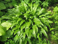 Но пожалуй, самая красивая из моих зеленых хост - подорожниковая (Н. plantaginea). Это крупное растение выглядит довольно импозантно благодаря своим крупным округлым тонким ярко-зеленым листьям, слегка волнистым по краям. В отличие от других видов, куст у нее несколько рыхловат. У этой хосты очень интересны и цветки. Они белые, как бы восковые, и душистые. Эта хоста прижилась у меня в тени рядом с сиренью и калиной Бульденеж.