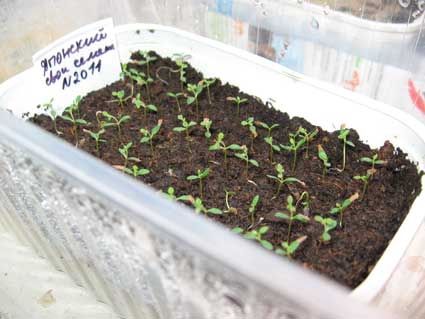 Когда минует угроза заморозков, вывожу сеянцы в сад, ставлю плошки с посевами в неплотной тени деревьев или кустов. Если подходящего места не находится, достаточно укрыть их от жаркого солнца лутрасилом или большим решетчатым пластиковым ящиком. Приученные к открытому воздуху сеянцы можно распикировать в грунт, а лучше - в более глубокие емкости или отдельные горшки (в прохладную и влажную неделю). В крайнем случае высадку в школку или в отдельные горшки можно отложить до весны следующего года.