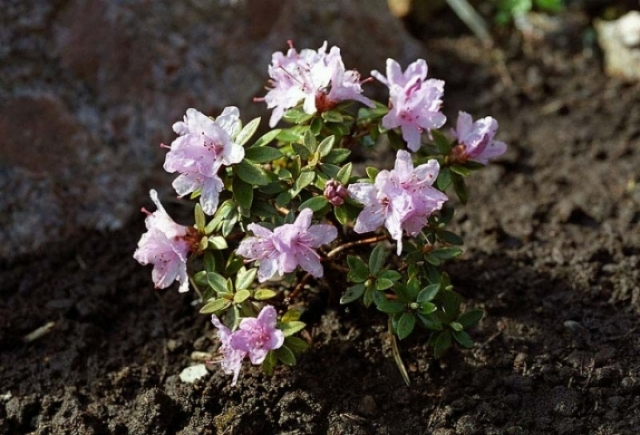 Очень хороши некрупные виды. У водоема прекрасно смотрится рододендрон канадский. У него красивые, узкие, сероватые листочки и розово-сиреневые цветки. Есть и совсем низкие виды, растущие на альпийской горке, - рододендроны плотный и краснеющий. Они резко отличаются от всех других окраской цветков (ярко-фиолетовые, даже в синеву).