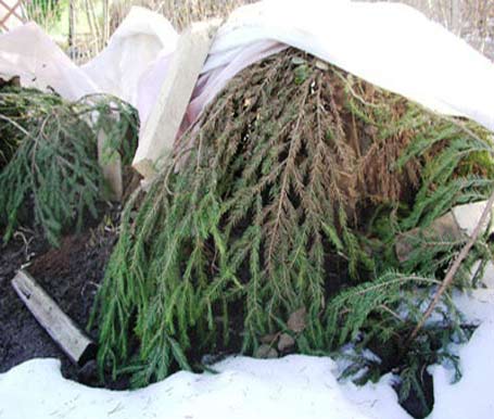 Можно сделать укрытие из синтетической или натуральной мешковины. Я предпочитаю искусственную. Опять же из соображений большей безопасности в плане гнили. При помощи строительного степлера из этой мешковины легко сделать защитные экраны. Правда, очень сильного ветра они боятся. Растущие вверх кусты можно, чуть связав, поместить целиком в мешки из искусственной мешковины. Я защищаю таким же образом и некоторые хвойные растения, в частности голубые можжевельники, которые тоже легко "горят" весной, а "сгорев", крайне трудно восстанавливаются.