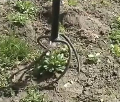 Сорняки (у нас это в основном пырей, конский щавель и одуванчик) удаляла двумя поворотами «Краба» - вправо-влево, затем поднимала вверх и стряхивала растения в сторону. Сорняки накручивались на зубья, корни не рвались. Даже не наклоняясь, культиватором можно складировать сорняки в кучи. А те сорняки, которые все же оставались на поверхности почвы, я затем собирала граблями. Особенно эффективно показал себя культиватор против пырея. Зубья глубоко входили в землю и вытаскивали корни, как проволоку, из нижних слоев почвы.