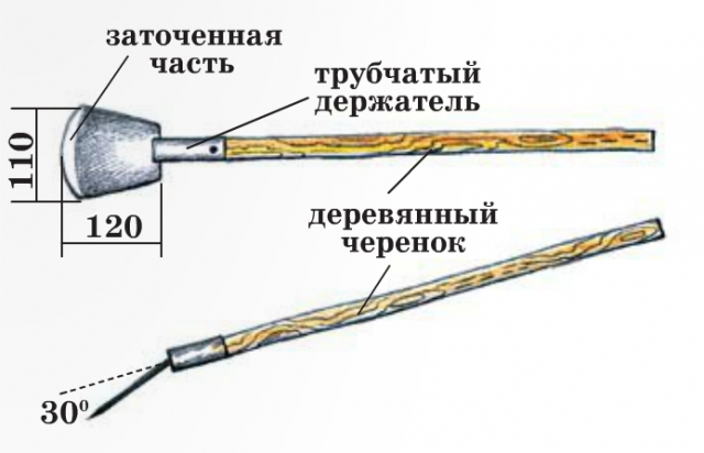 Срезал держатель, который был приварен под углом 90 градусов, и вновь приварил, но уже под углом 30 градусов. И получилось орудие наподобие кухонной лопаточки, которая есть у каждой хозяйки.Такая легкая мотыга незаменимый помощник в саду.
