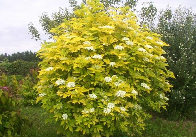 Некоторое время мы с соседкой не знали, как называются красивые кустарники, которые вместе купили на станции. Ранней весной кусты покрываются нежными резными листьями, и вскоре начинают отрастать многочисленные побеги. Затем на них распускаются белые плоские соцветия (10-15 см в диаметре), которые почти полностью покрывают куст в конце июля. Любоваться их пышным и длительным цветением к нам приходят многие садоводы не только из нашего товарищества, но и из соседних.