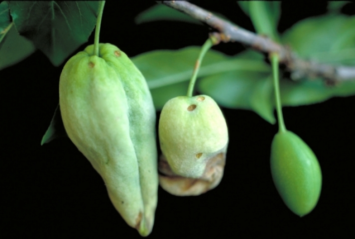 Так проявляется болезнь, известная под названием кармашки слив. Она встречается на косточковых растениях. Поражаются в основном плоды, реже - цветки. Больные плоды имеют уродливую изогнутую форму в виде стручка. Длина его около 3 см. Плоды мясистые, но несочные, сморщенные, зеленоватые, без косточки, непригодны в пищу. В конце июля поверхность пораженных плодов покрывается беловато-серым восковым налетом, содержащим споры гриба. В течение года развивается только одно его поколение. На дереве кармашки долго не держатся. Ко времени созревания они буреют и осыпаются. Развитию болезни благоприятствуют высокая влажность и умеренная температура (20-23°) во время цветения.