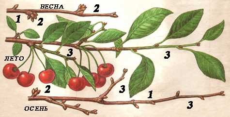 У древовидных вишен можно, не опасаясь, укорачивать (при необходимости) однолетние приросты. Точки роста есть в букетных веточках, поэтому укороченные веточки нормально отрастают. В отличие от них у кустов вишен укорачивание однолетнего прироста приводит к усыханию оставшейся ветви. Это происходит потому, что точка роста есть только на конце, а все боковые почки - цветковые (без точек роста).