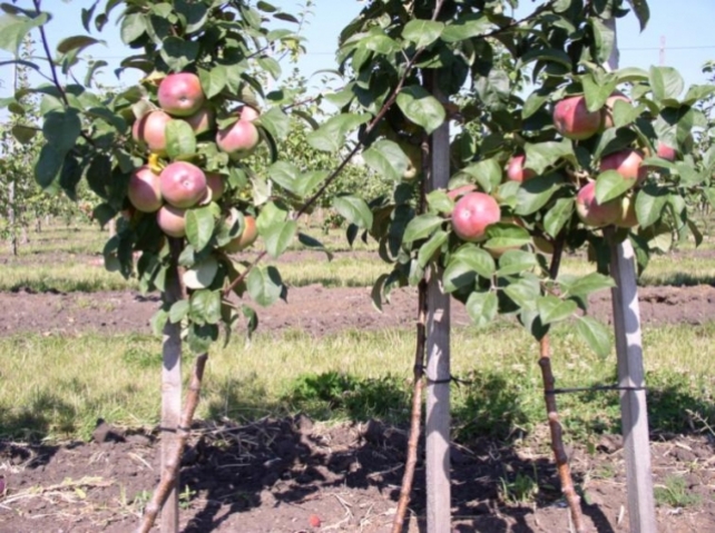 Хороший результат дает применение раствора Гумикса до трех раз за вегетацию, это позволяет нарастить корни карлика в 2-3 раза быстрее (что, кстати, подтвердили раскопки и размывы корней). Для опоры натянуть 2-3 ряда проволоки между столбами и подвязать ветки и стволики к ним. Формировать деревья можно по-разному, но я склоняюсь к пальметте. В наших условиях, где тепло и свет в дефиците, это позволит максимально снизить отрицательное влияние климата.