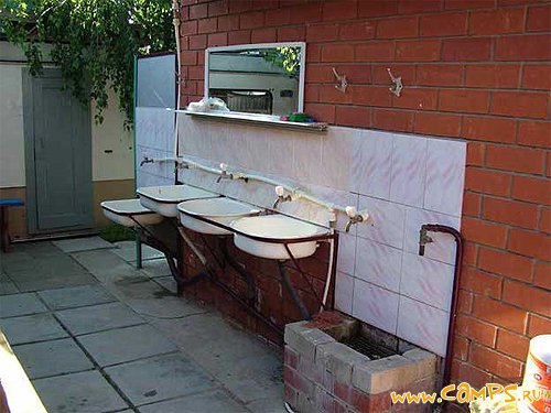 Кому не приходилось мыть на участке под струей из дачного умывальника овощи (не нести же с грязью в дом), обувь (резиновые сапожки, галоши, без которых не обойтись в дождливый день)? Делать это под краном неудобно - брызги летят во все стороны. Пока вымоешь обувь -сам весь вымокнешь. Для этого в качестве уличного умывальника можно приспособить старую чугунную раковину (в городской квартире многие от такой уже отказались - слишком тяжелая да и выглядит несовременно). Укрепить ее на подставке из кирпича, подвести трубу летнего водопровода и установить кран (можно бывший в употреблении) - просто и опять же удобно!