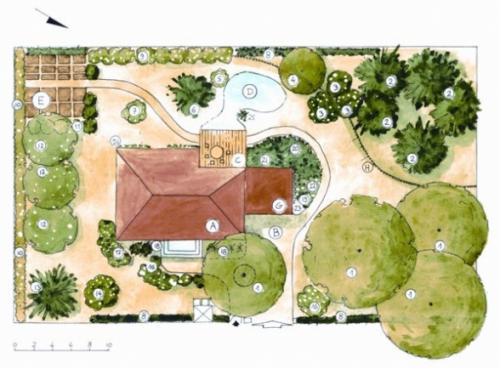 Дому мы определили место на северной стороне участка, чтобы защитить сад от северных ветров. Там же построили баню и сделали между постройками крытый переход. Чтобы растениям досталось больше хорошо освещаемой солнцем территории, гараж мы пристроили к глухой стене дома с северной стороны. Въезд в него - с дороги. Такая планировка не противоречит существующим нормам. У нас от дома до соседнего участка 3 м, а внутри участка противопожарные нормы не лимитируют расстояние от дома до бани.