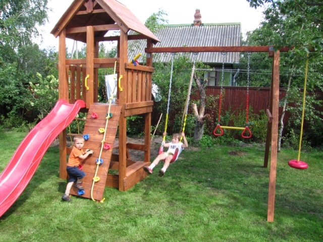 Когда дети выросли из пеленок, им понадобился свой уголок. Перед гостевым домиком на открытом месте сделали игровую площадку, поставили качели и песочницу. Девочкам очень нравится играть здесь, возиться на траве, да и нам удобнее за ними присматривать. Маленькие дети очень подвижны и часто не замечают препятствий на своем пути. Для их безопасности разбили на участке газоны и убрали деревья с низкой раскидистой кроной, чтобы дети случайно не поранились.
